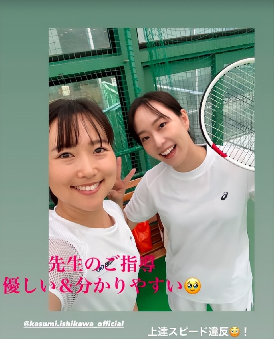 石川佳纯甚至还跨界打起了网球。她于19日更新了Instagram快拍,展示了她的网球装扮。只见她上传了身着白色T恤与白色短裤、手持球拍和网球的模样。还分享了与职业网球选手今西美晴、2016年里约奥运会铜牌得主皮划艇选手羽根田卓也的三人的合影。看来是向今西美晴学习了网球技巧,她称赞"老师的指导既温柔又易懂"。今西美晴则对她赞叹道:"进步速度太快!击球后的准备(下一拍)姿势实在太完美了"。